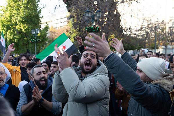 Εκατοντάδες Σύροι συγκεντρώθηκαν το μεσημέρι της Κυριακής 8 Δεκεμβρίου στην πλατεία Συντάγματος όπου ανεμίζοντας σημαίες της χώρας τους, τραγουδώντας και φωνάζοντας συνθήματα, πανηγύρισαν για την ανατροπή του Άσαντ.